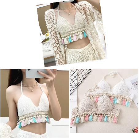 - Style: It embodies a bohemian or "boho-chic" aesthetic, often worn as a standalone top, a bikini top, or layered under a light cardigan or kimono cover-up, as shown in the top image.