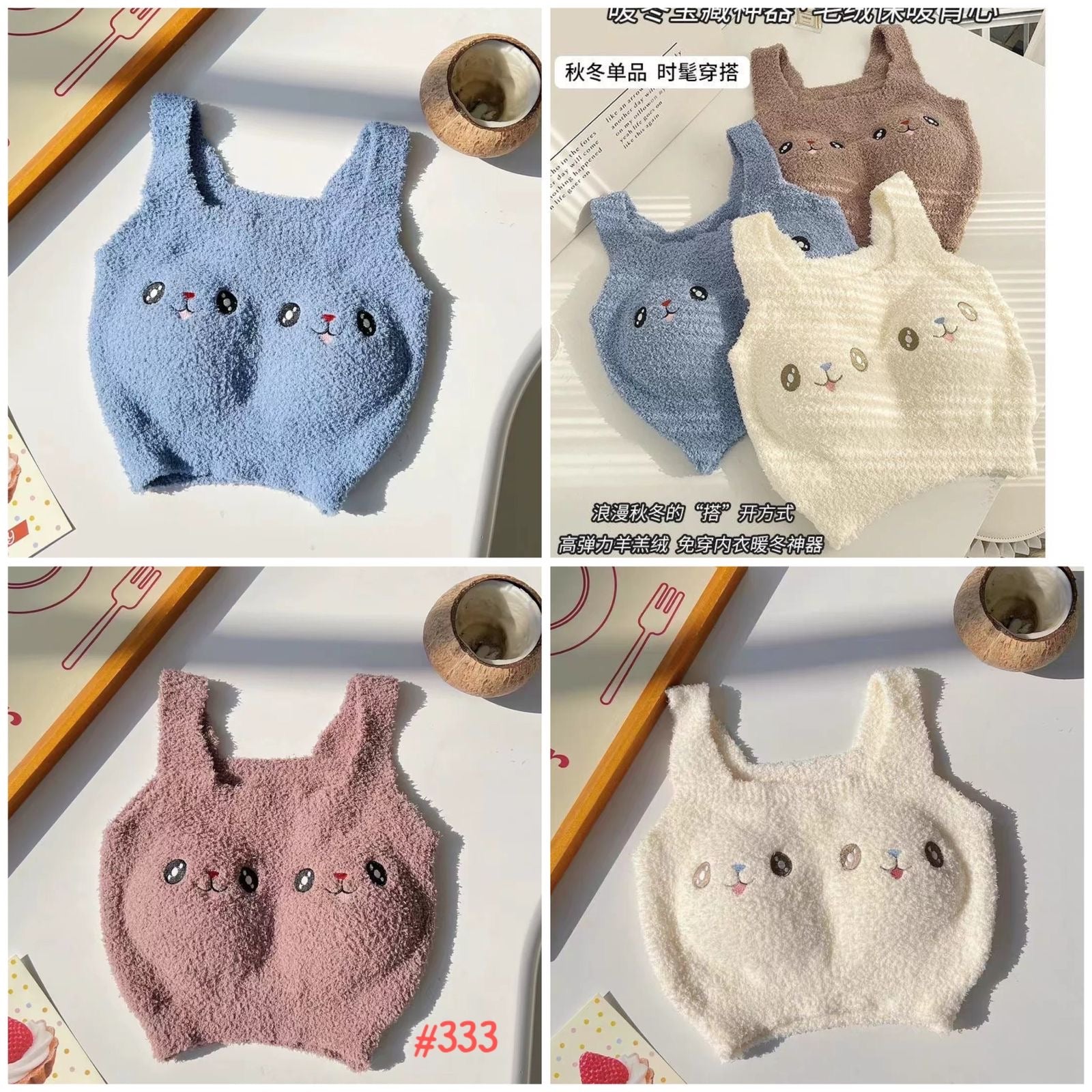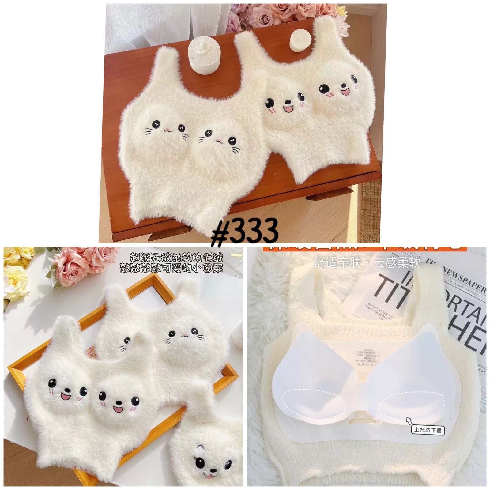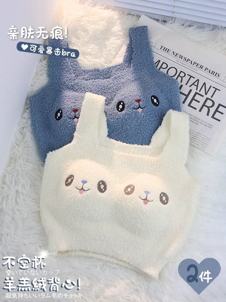 This item is a fluffy, plush built-in bra top or lingerie set, often marketed as "fluffy friend" or "kawaii" style underwear. It is made of a soft, furry material and features cute embroidered animal faces, likely bunnies or cats. The design is a non-wired, padded top intended to be comfortable and provide support.