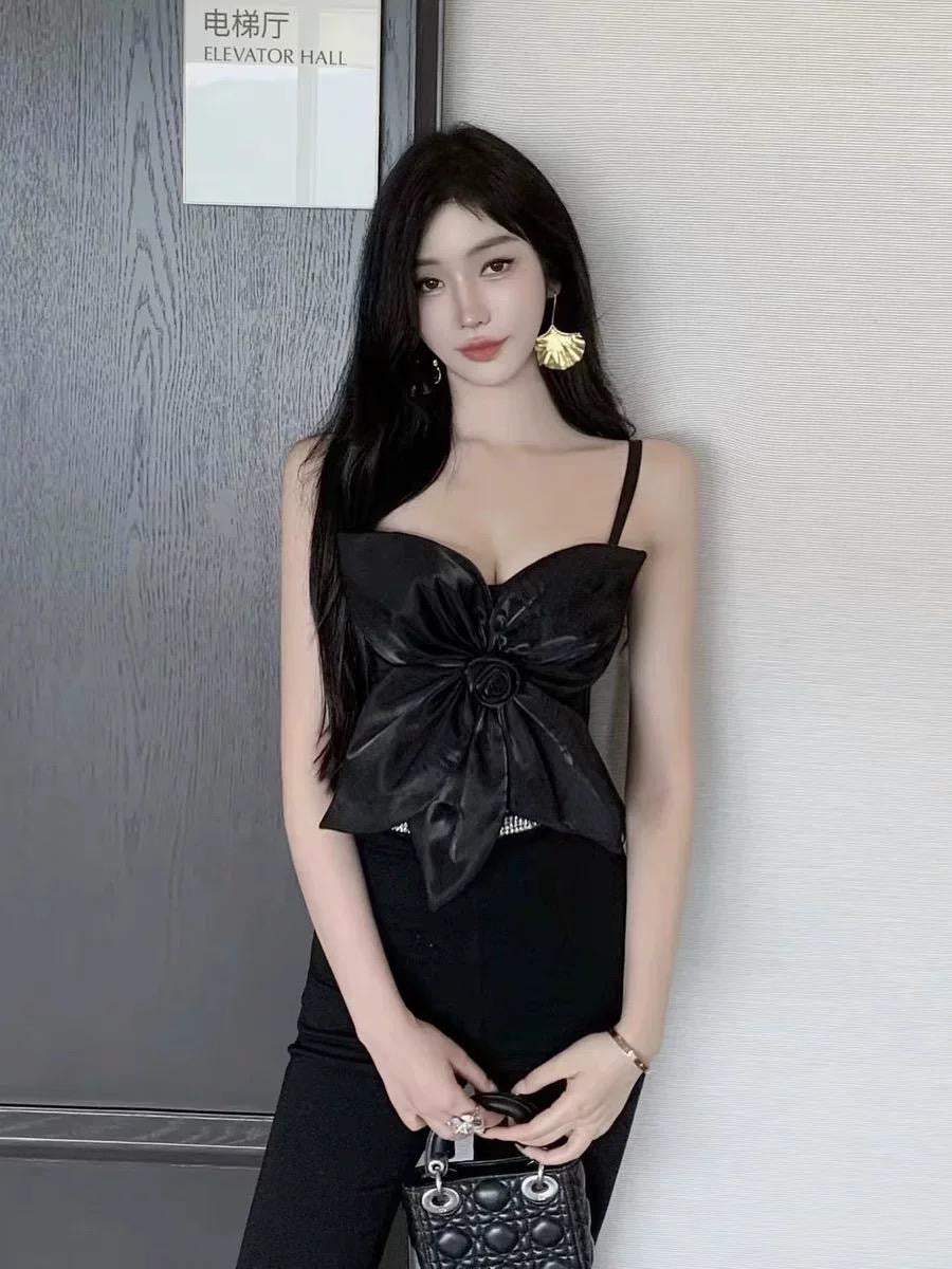 satin or stain-look bustier crop top with a prominent, oversized bow detail and delicate spaghetti straps.